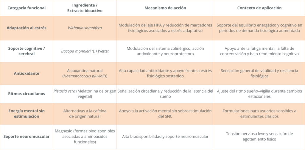 Los ingredientes aquí descritos han sido evaluados en contextos de estrés, alteraciones del descanso y fatiga funcional, compartiendo mecanismos fisiológicos relevantes con los procesos de adaptación estacional. Su combinación estratégica permite el desarrollo de soluciones estacionales científicamente fundamentadas, alineadas con un enfoque de bienestar y comunicación responsable (7-11).