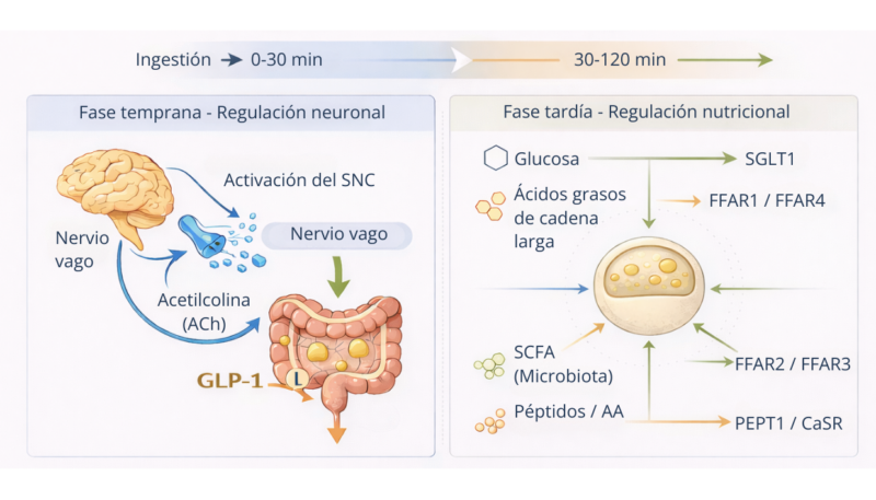 Tras la ingesta se produce una primera fase temprana mediada por la activación vagal y diferentes mecanismos neuroendocrinos, seguida de una segunda fase dependiente del contacto directo de los nutrientes con el intestino (1). En la segunda en cuestión, la glucosa, los ácidos grasos, los ácidos grasos de cadena corta derivados de la microbiota y los péptidos o aminoácidos estimulan las células L intestinales a través de receptores y transportadores específicos (1,7).
